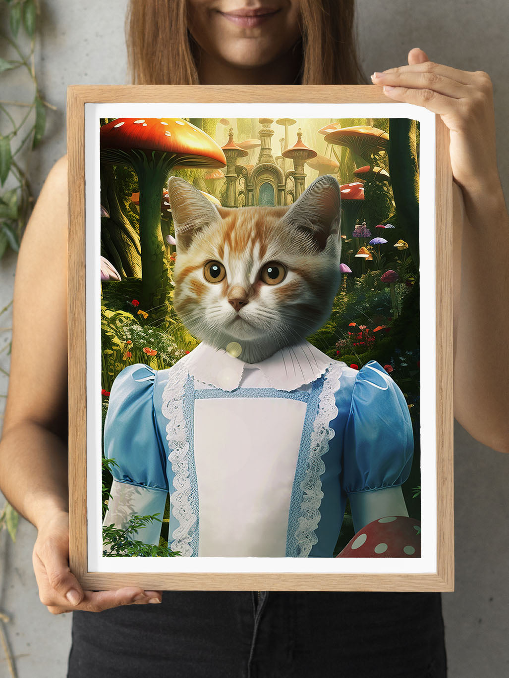 Transform your furry friend into the iconic Alice in Wonderland with this unique custom pet portrait. Perfect for any pet enthusiast. this beautiful portrait will bring a smile to your face every time you look at it! Upload a photo and our artists will transform your pet into a stunning masterpiece.