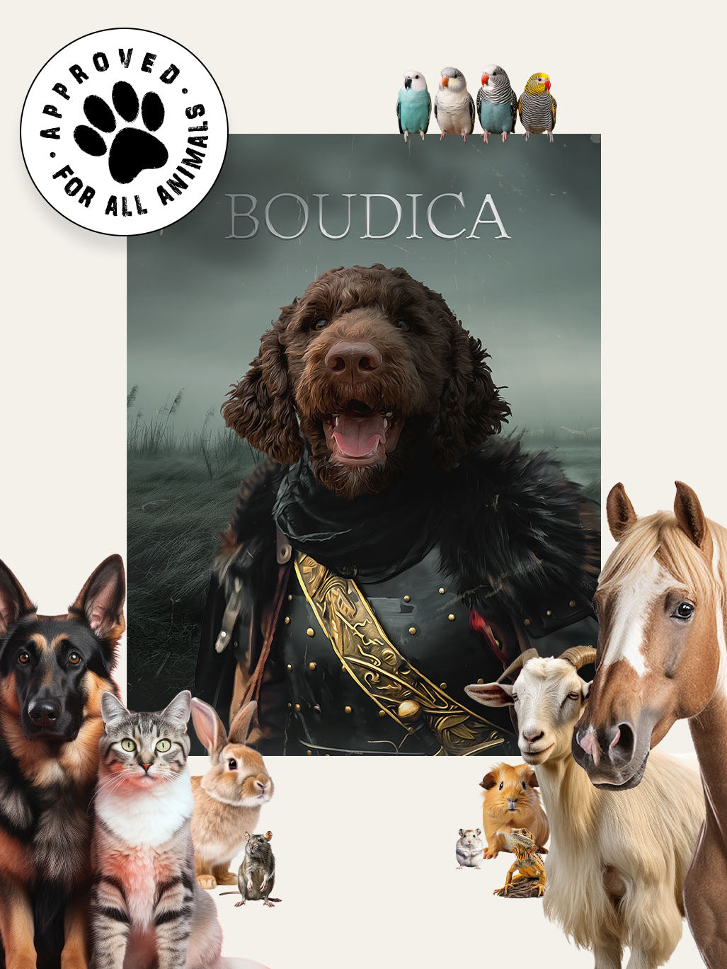 Turn your pet into the heroic figure of the past with our exquisite highly detailed custom pet portrait. Simply upload a photo and our artists will transform your pet into a stunning masterpiece.