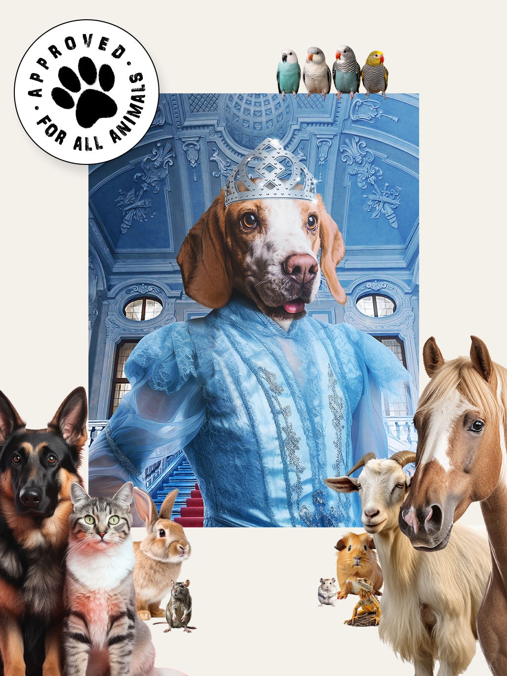 Bring your pet's fairytale dreams to life with a custom Cinderella portrait featuring your pet! Our artist will create a magical portrait with your pet as the star of the story. Let your pet be the Princess they always wanted to be! Upload a photo and our artists will transform your pet into a stunning masterpiece.