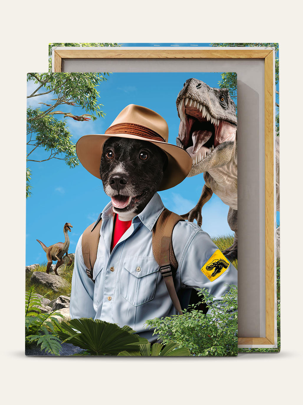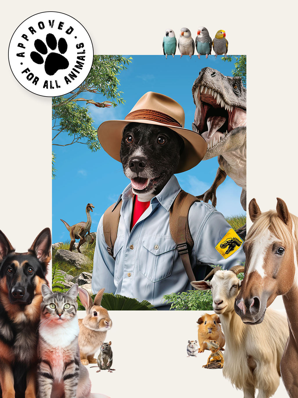Bring your pet to life with the Dino Explorer custom pet portrait! Featuring your pet as a dinosaur scientist. it's the perfect way to show off their unique personality. Upload a photo and our artists will transform your pet into a stunning masterpiece.