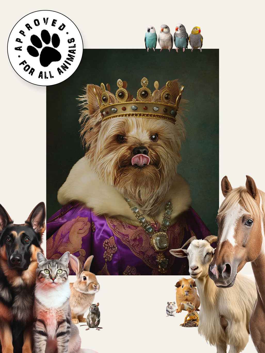Behold! Introducing the Royal Highness Pet Portrait! Turn your furry friend into a majestic monarch with this realistic. regal masterpiece. Show off your pet's royal side and let them snuggle up on their throne of comfort. Crown up! Upload a photo and our artists will transform your pet into a stunning masterpiece.
