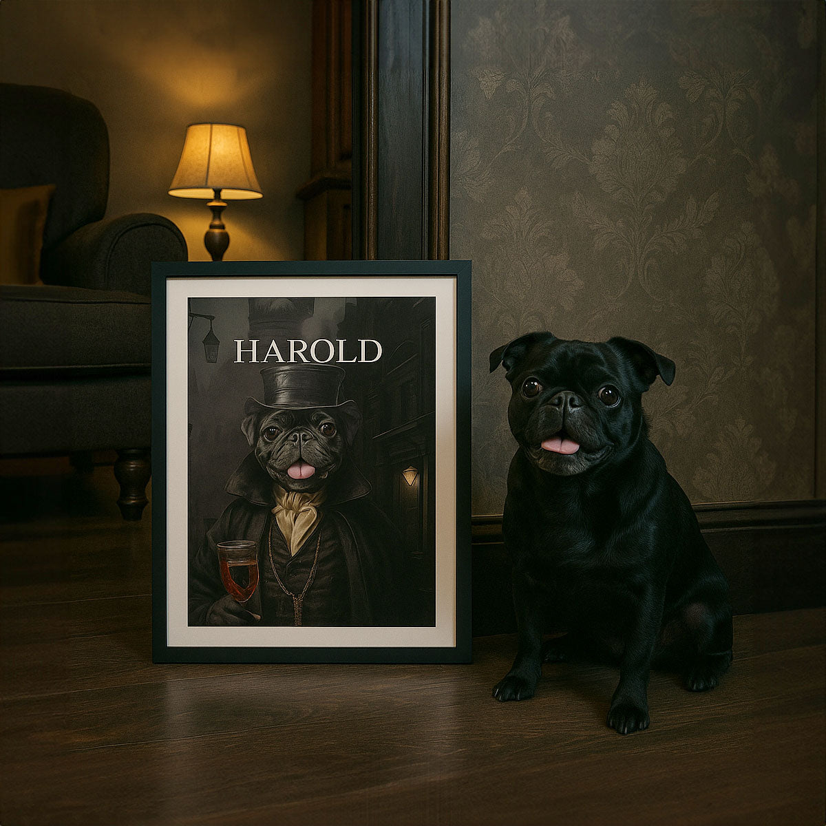 Celebrate your beloved pet with this custom pet portrait featuring your pet as a Victorian-era gangster. Let your pet lounge in style while embracing their regal and rebellious side. Upload a photo and our artists will transform your pet into a stunning masterpiece.
